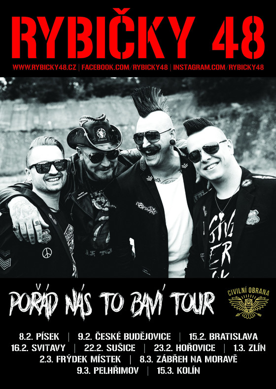 Právě zde byla pořízena část jednoho z vrcholů celého podzimního turné. Zlatým hřebem se však stala, po střechu zaplněná, brněnská Hala Vodova, která byla zatím největším samostatným koncertem skupiny. Nadšení a energie pěti tisíc fanoušků i kapely samotné je zachyceno a sestřiháno v novinkovém live klipu NA PRVNÍ DOJEM.Kuba Ryba dodává a skládá poklonu fandům: „Máme nový klip, který můžete brát jako náš novoroční projev. Klip byl natočen na vyprodaných koncertech v Paláci Lucerna v Praze a v Hale Vodova v Brně. Tím pádem se v roli herců objevuje pár tisíc vás, fanoušků. My vám chceme poděkovat, protože vy nejste komparz, ale naše hlavní hvězdy a bez vás by nemělo nic z toho, co děláme, smysl.“ Skupina Rybičky 48 po dlouhých šesti letech na sklonku minulého roku vydala dvojalbum BEST FUCK OFF/Pořád nás to baví. První část nazvaná BEST FUCK OFF obsáhla singly natočené od června roku 2015 do této doby a na druhém albu Pořád nás to baví představila kapela autorské písně jednotlivých muzikantů bez jakýchkoli žánrových hranic. A právě po nové desce, je nazváno jarní POŘÁD NÁS TO BAVÍ TOUR 2019. Na tomto turné zazní úplně poprvé živě písně z tohoto alba, samozřejmě nebudou chybět osvědčené hity. POŘÁD NÁS TO BAVÍ TOUR 2019 startuje 8.února v Písku. Kluci pilně trénují nejen nové písně, ale připravují i atraktivní koncertní scénu a jako jeden hlas vzkazují: „Do nového roku přejeme nám všem pevné zdraví, splnění tajných přání, správný díl štěstí, pravou lásku, klid a spokojenost na duši.“