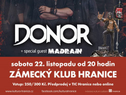 Zámecký klub v Hranicích čeká další koncert ze série Spark Rock Shows. V sobotu 22. listopadu od 20 hodin rozezní prostory Zámeckého klubu Hranice kapela DONOR, jako speciální host vystoupí MADRAIN. Merch DONOR seženete zde