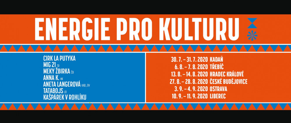 Umělecká scéna šesti měst zažije vždy ve čtvrtek a v pátek divadelní a artistická představení a koncerty pod širým nebem. Energie pro kulturu proteče křížem krážem celou republikou, od 30. července v Kadani, přes Třebíč, Hradec Králové, České Budějovice, Ostravu až po Liberec, kde se 11.9.2020 zastaví.